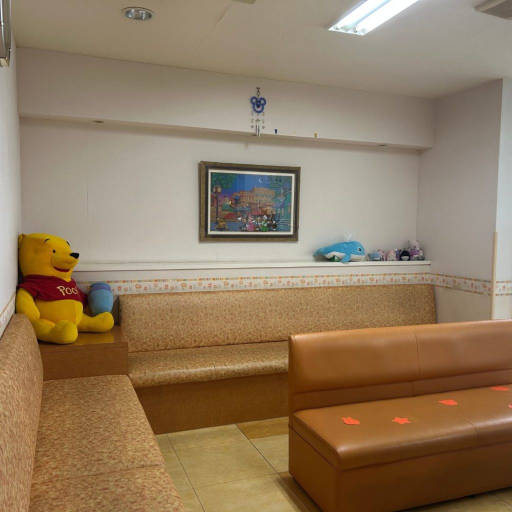 オレンジのカラーでまとめた待合室です。待ってるあいだアンパンマンのビデオが見れます。